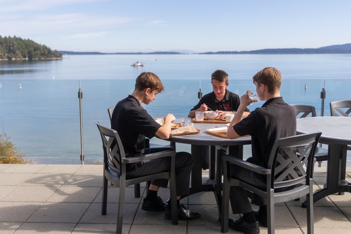 Boys enjoying school lunch on the patio